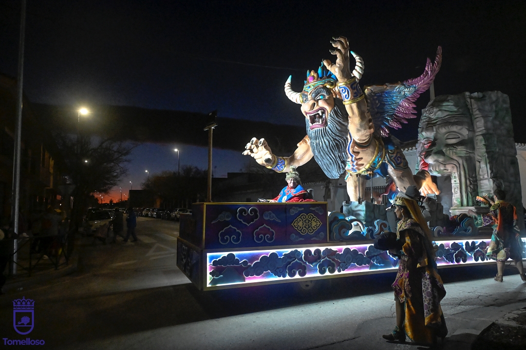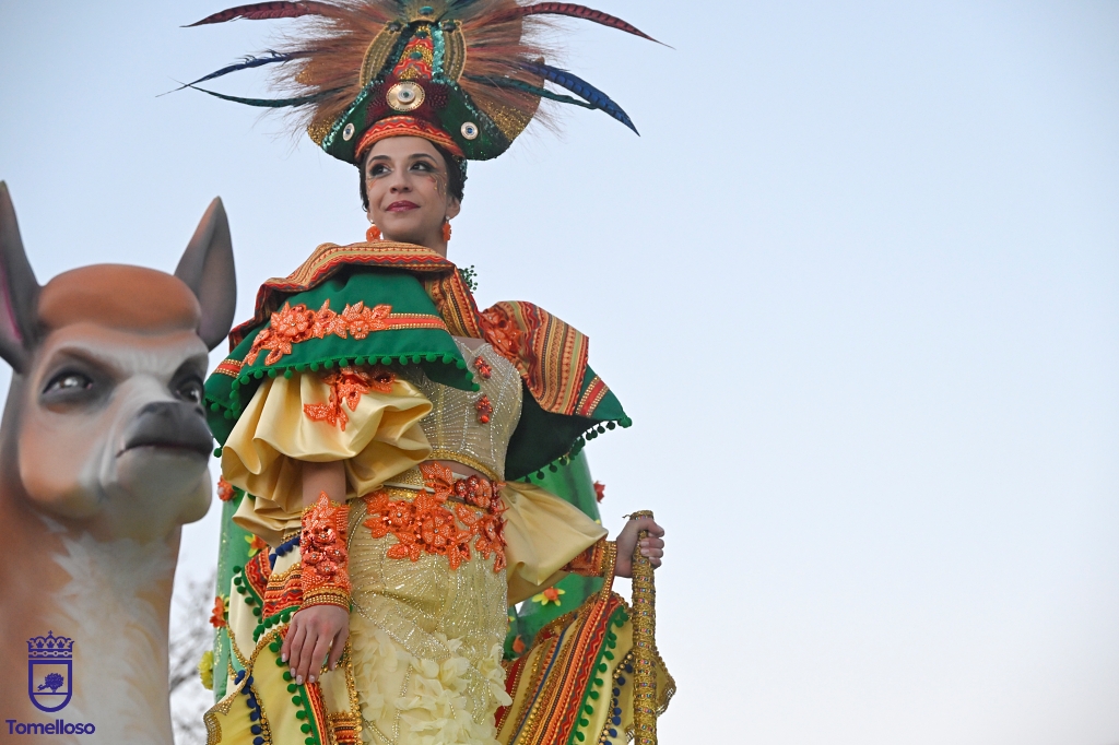 La propuesta ganadora en la categoría de carrozas, Mongolia: El Imperio del Cielo Azul, un recorrido por la cultura, la tradición y la mitología del país asiático ha incluido pequeños dragones, criaturas fantásticas, danzas tradicionales, rituales y celebraciones antiguas, bailarinas con vistosos trajes, comerciantes de seda y guerreros de uno de los imperios más grandes de la historia. Completaban la escenografía cuatro carrozas, la primera de ellas representando un caballo sagrado, símbolo de poder y compañerismo, seguida de otras con cabezas de dragón, en conexión con la mitología. Todo ello con sus habituales ritmos trepidantes y sus bailes llenos de fuerza.