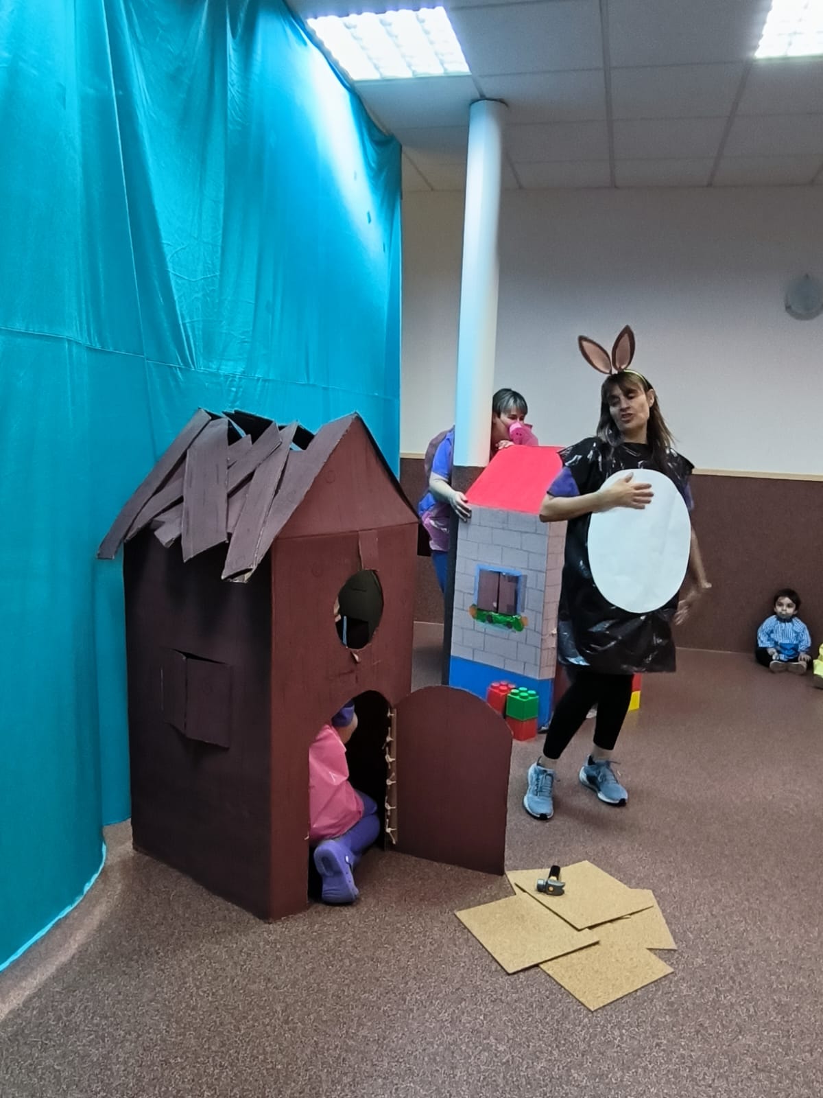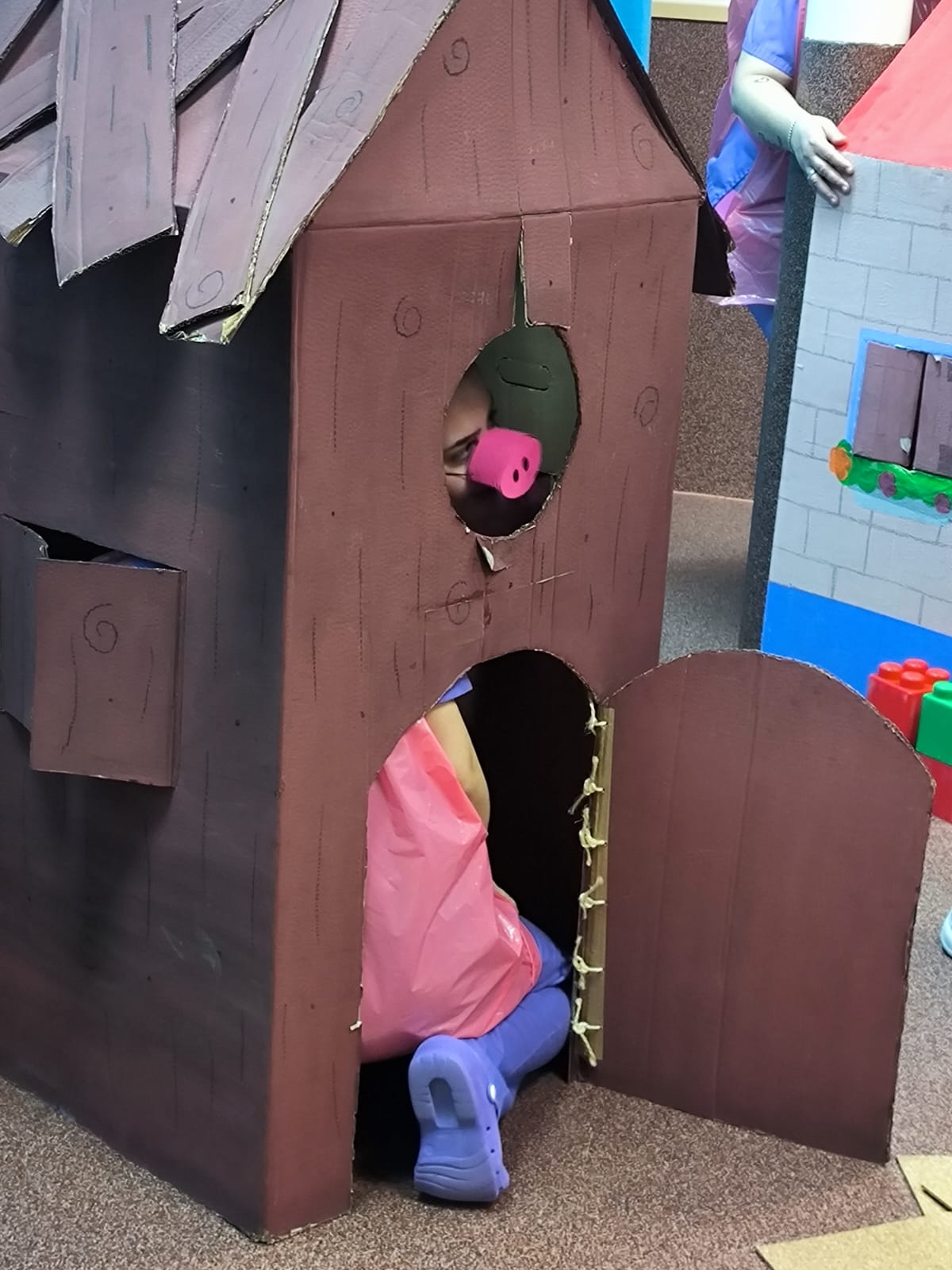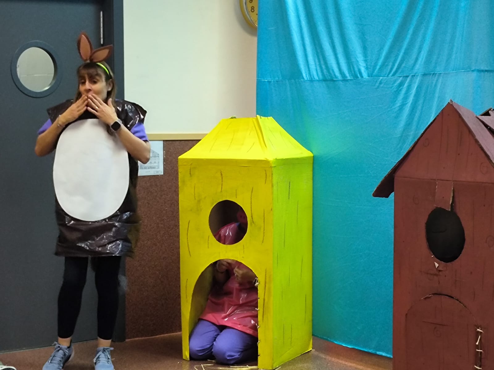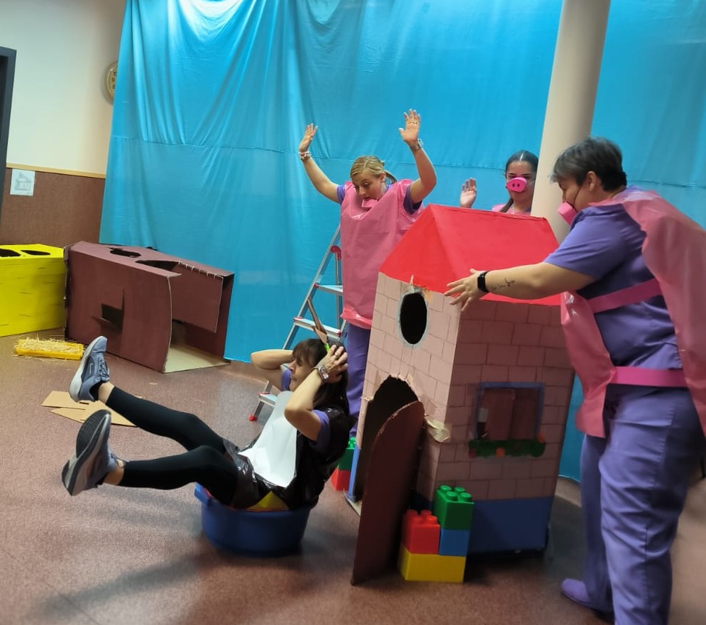 En esta ocasión, hemos representado el cuento de Los tres cerditos. Las educadoras interpretaron a los diferentes personajes, dando vida a los cerditos y al lobo. De esta manera, los niños pudieron seguir la historia de forma visual y divertida, participando con sus reacciones, risas y comentarios.